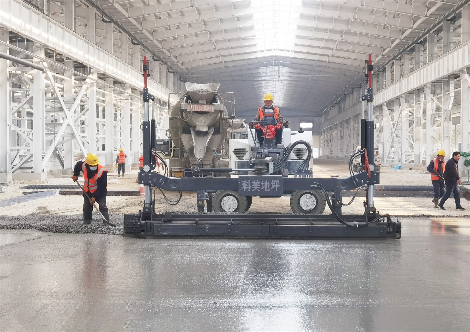 3.刮尺找平:用鋁合金刮尺均勻地將金剛砂耐磨材料沿縱橫方向找平